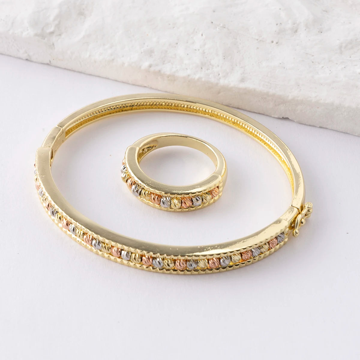 This Moroccan Caftan-inspired wedding jewelry set is perfect for adding a touch of elegance and romance to any special occasion. Made from high-quality copper and gold-plated, this set includes a bracelet and a ring with green stones. It is lead, nickel, and cadmium-free, ensuring safety and durability. Ideal for weddings, anniversaries, or gifts for loved ones.