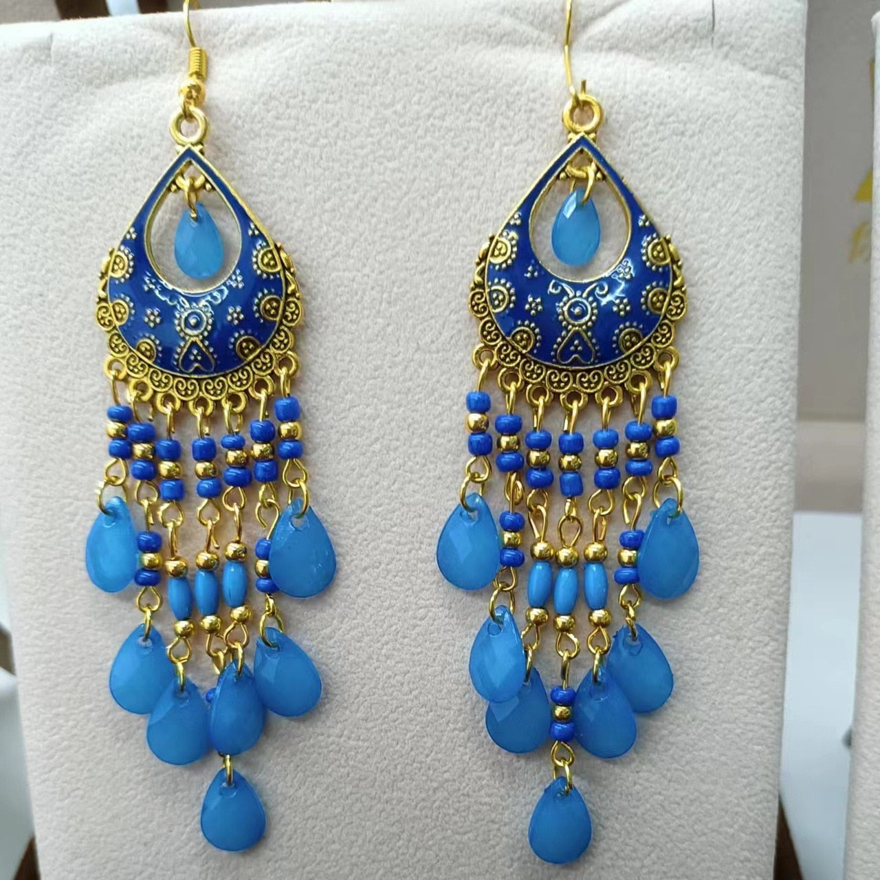 These Bohemia Ethnic Fringed Tassel Earrings boast a stylishly geometric shape and are crafted with a glossy acrylic water drop. Women of all ages will love wearing these beautiful metal earrings.