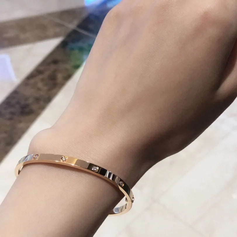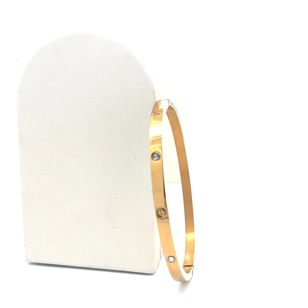 This women's cuff bracelet combines classic style with fashion-forward design. Crafted from durable stainless steel and plated with a luxurious gold-color finish, it exudes elegance and sophistication. The bracelet features a geometric shape/pattern, adding a modern touch to its classic style. With its compatibility with all accessories and GLUE setting type, this bracelet offers both versatility and durability.