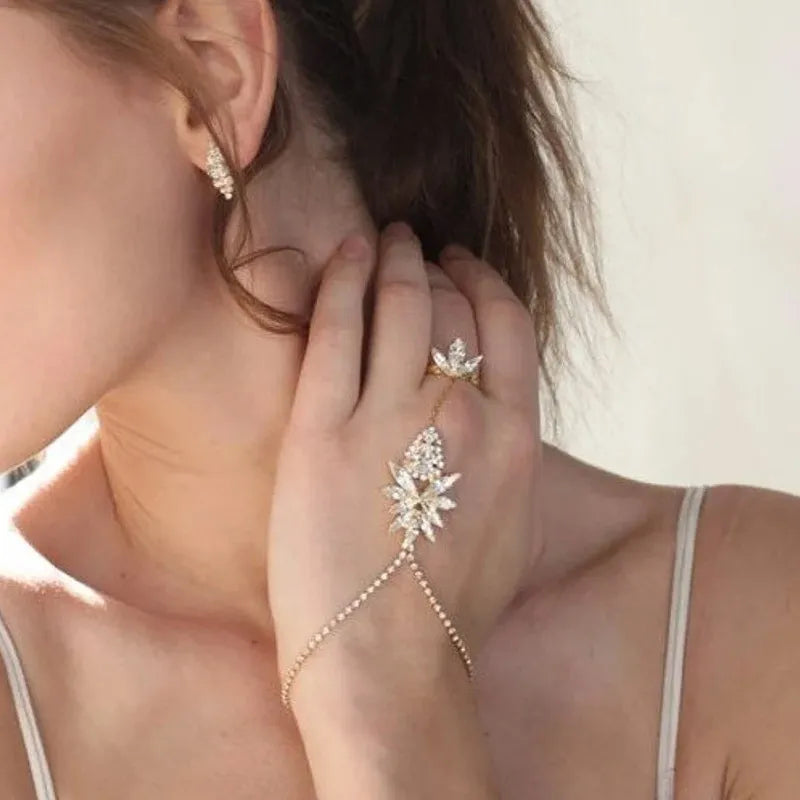 Bridal Crystal Ring Bracelet Chain Wedding Jewelry for Women Fashion Rhinestone Finger Bracelet Wrist Chain Party