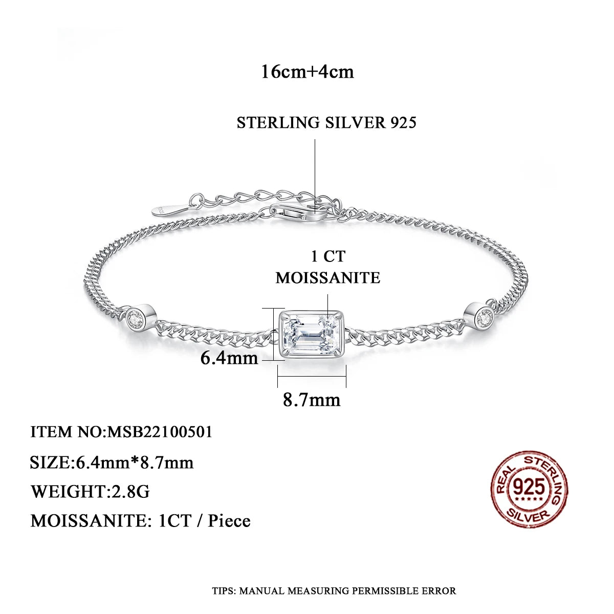 Add Chain Link Bracelet Moissanite 1CT Emerald Cut Real 925 Sterling Silver Women Luxury Trendy Hand Bracelets Jewelry to the cart