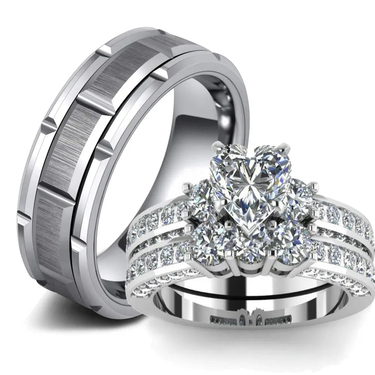 Fashion Couple Rings For Women Heart Rhinestones Zirconia Rings Set Trendy Men Stainless Steel Ring Wedding Band Jewelry Gifts