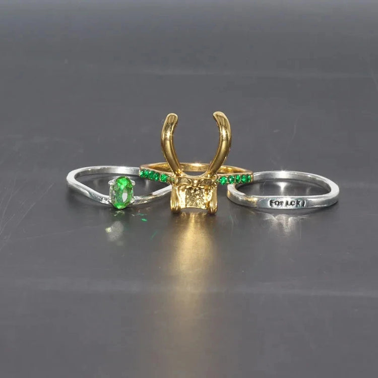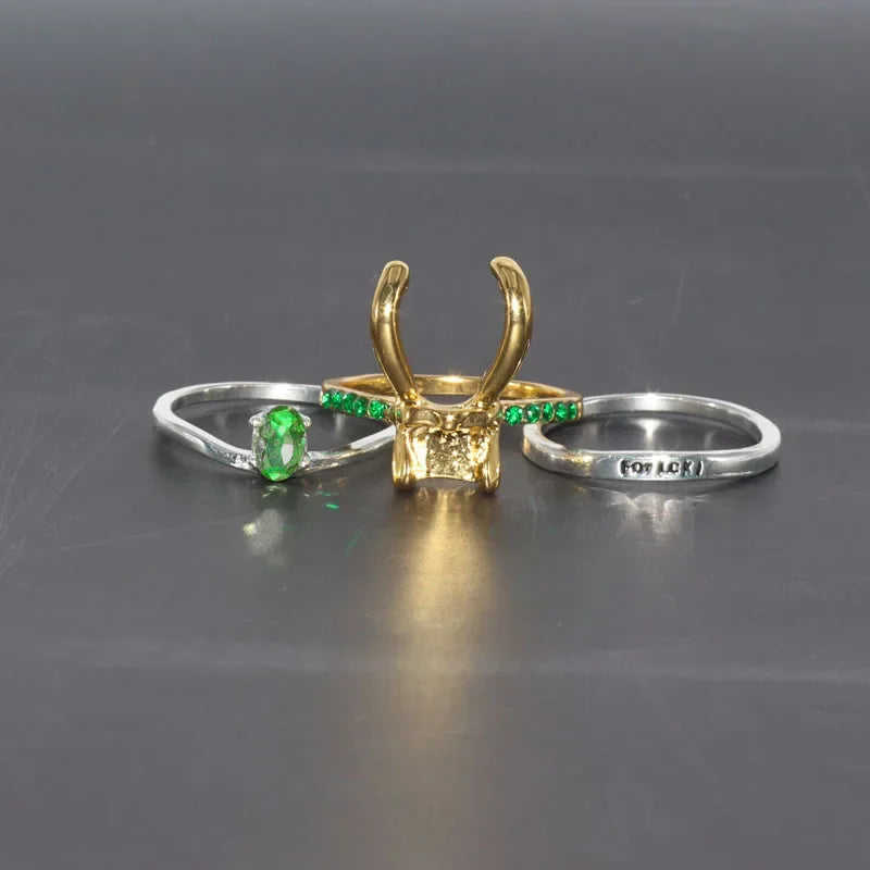 Embrace your inner superhero with our Loki Ring Set. Featuring a green crystal crown and helmet design, these rings are perfect for fans of Thor and Loki. Ideal for both men and women, these stacking rings make a striking addition to your cosplay accessories or everyday jewelry collection.