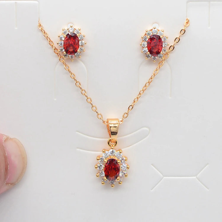 Fashion Gold Color Women Red Cubic Zirconia Romantic Oval Stud Earrings & Pendant Wedding Jewelry Set