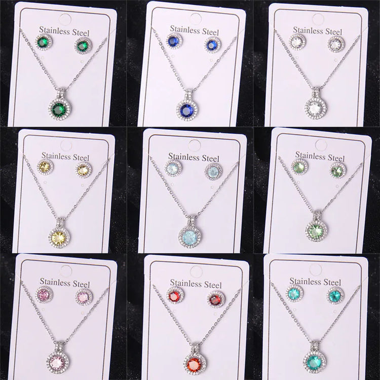 High Grade Round Zircon Jewelry Set Trendy Popular Stainless Steel Pendant Necklace Stud Earrings Party Gifts For Women Girls