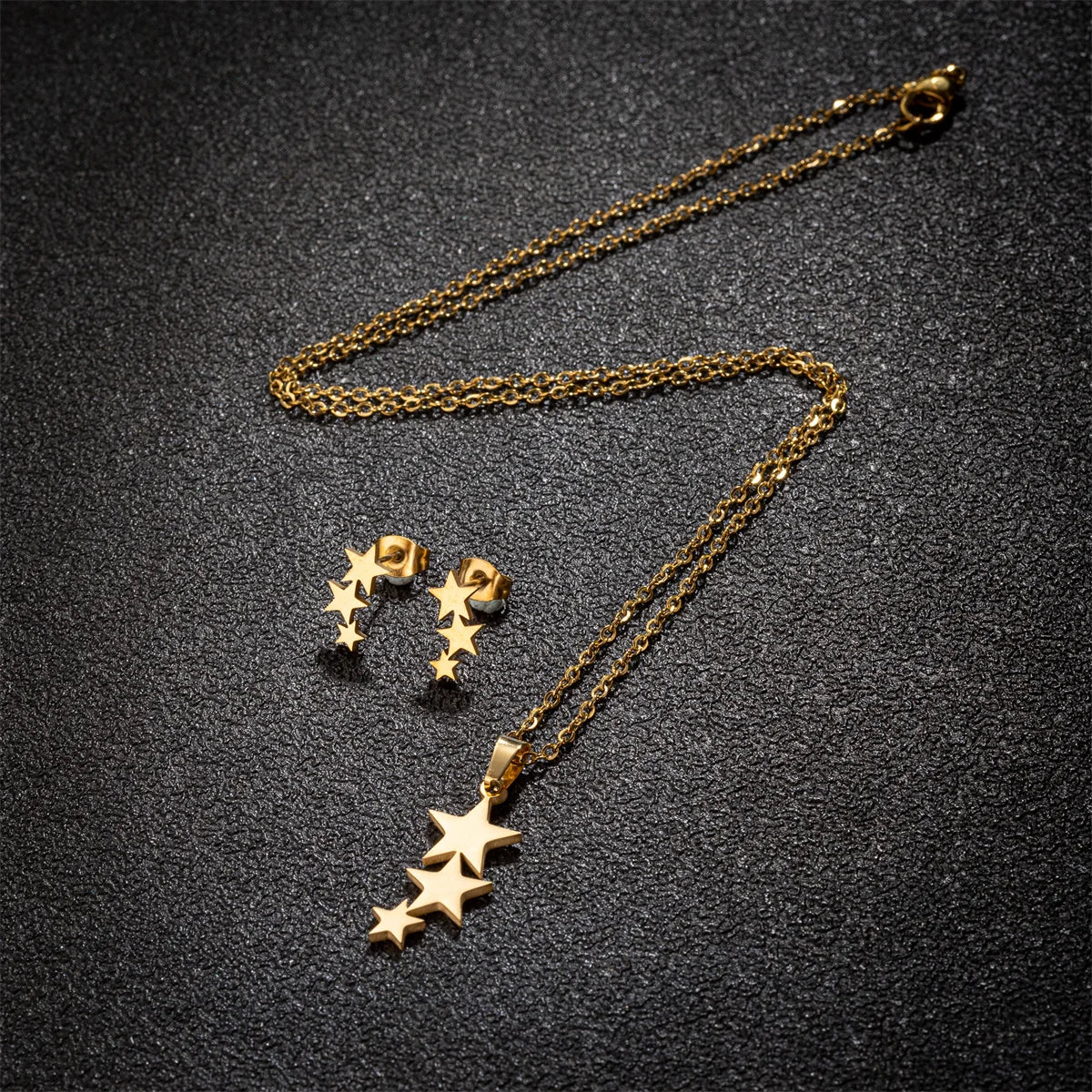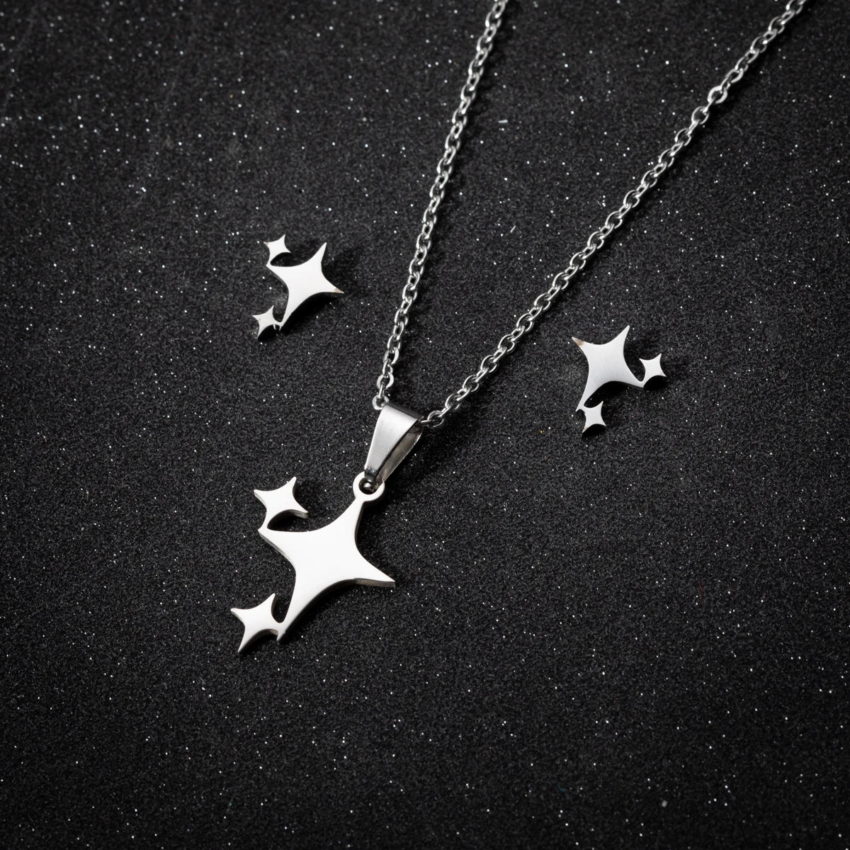 Luxury stainless steel jewelry set featuring a star-shaped necklace and matching earrings. Designed in a sleek gold or silver finish, this lightweight and stylish set is perfect for weddings, parties, or casual occasions. Durable and trendy, ideal for modern women with a sporty or casual style.